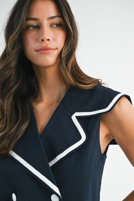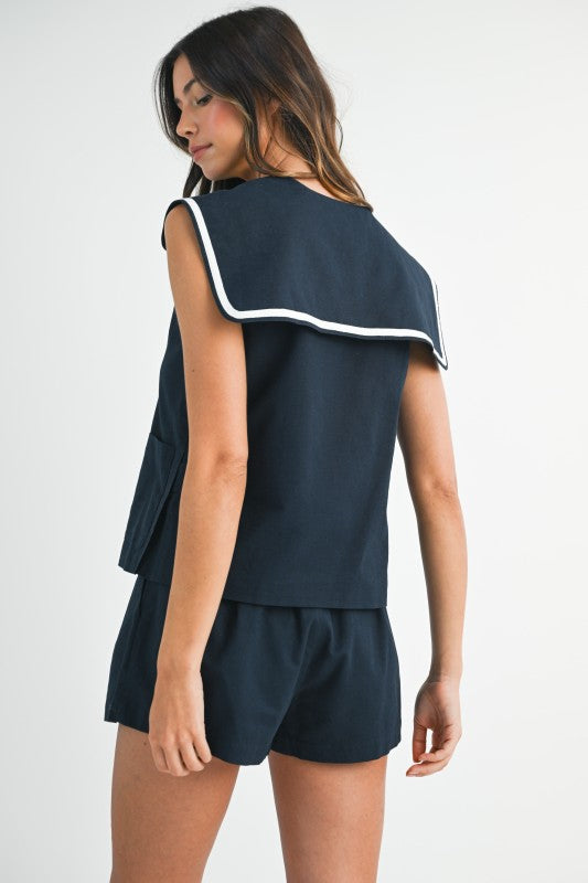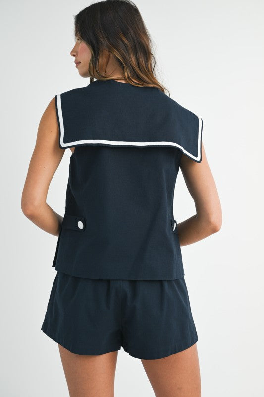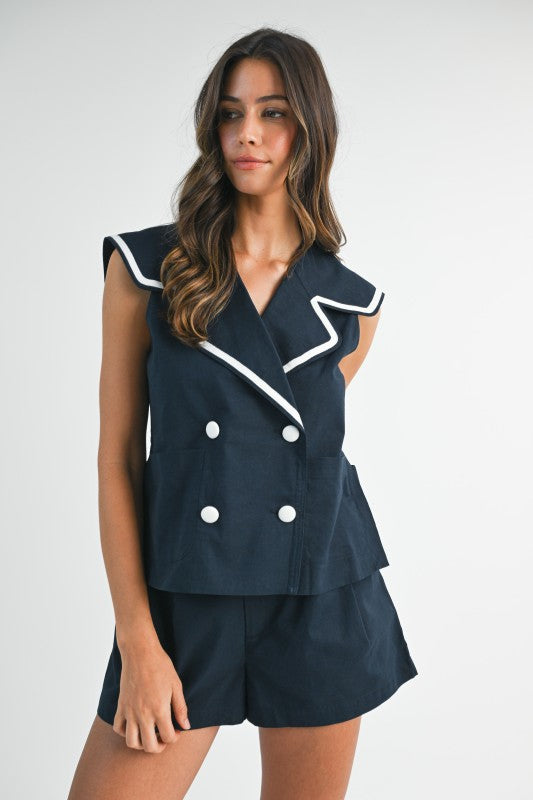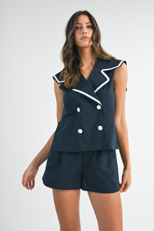 Effortlessly chic. This sailor-inspired linen vest and shorts set is your go-to for sophistication. Marina is crafted from a breathable, lightweight linen/rayon blend, the tailored vest features classic sailor-style detailing with a structured fit and button-front closure. The coordinating high-waisted shorts are designed for comfort and ease, complete with subtle pleats and a flattering silhouette. Perfect for seaside strolls, brunch, or vacation days, this set brings timeless coastal charm to your wardrobe.